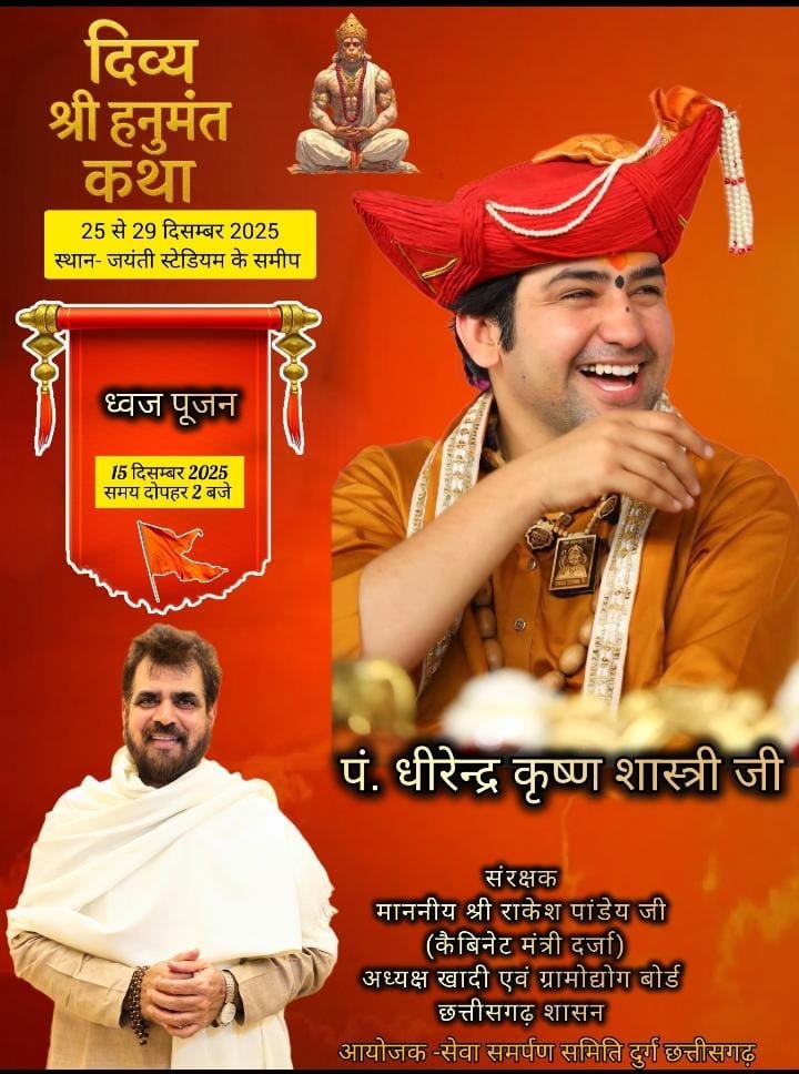 भिलाई – सेवा समर्पण संस्था दुर्ग द्वारा कल दोपहर 02:00 बजे दिन सोमवार 15/12/2025 को दिव्य श्री हनुमंत कथा के कार्यक्रम स्थल पर ध्वज पूजन समारोह का आयोजन किया गया है।