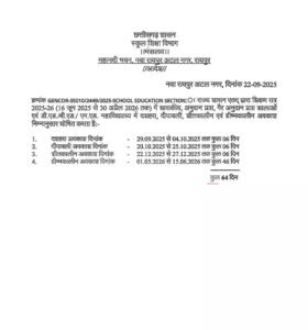 रायपुर – छत्तीसगढ़ स्कूल शिक्षा विभाग ने 64 दिनों का अवकाश जारी किया है। स्कूल शिक्षा विभाग के अवर सचिव आरपी वर्मा ने यह आदेश जारी किया है।