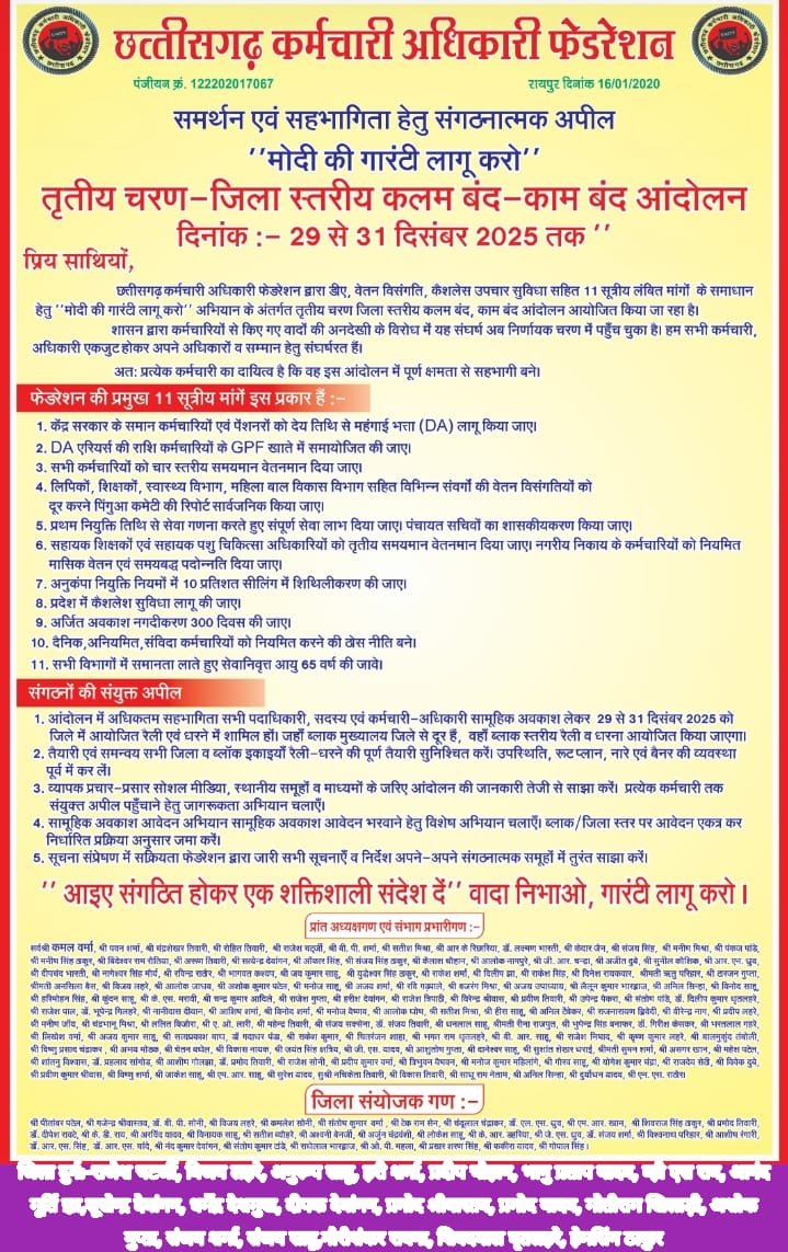 रायपुर/दुर्ग – छत्तीसगढ़ कर्मचारी अधिकारी फेडरेशन ने अपनी लंबित 11 सूत्रीय मांगों को लेकर तीसरे चरण का जिला स्तरीय आंदोलन तेज कर दिया है। फेडरेशन ने घोषणा की है कि 29, 30 और 31 दिसंबर 2025 को पूरे प्रदेश में कलमबंद–कामबंद आंदोलन आयोजित किया जाएगा। इस दौरान सभी कर्मचारी-अधिकारी कार्यस्थलों पर उपस्थित तो रहेंगे, लेकिन कोई सरकारी कार्य नहीं करेंगे। संगठन ने सभी कर्मचारियों से पूर्ण एकजुटता के साथ आंदोलन में शामिल होने की अपील की है।