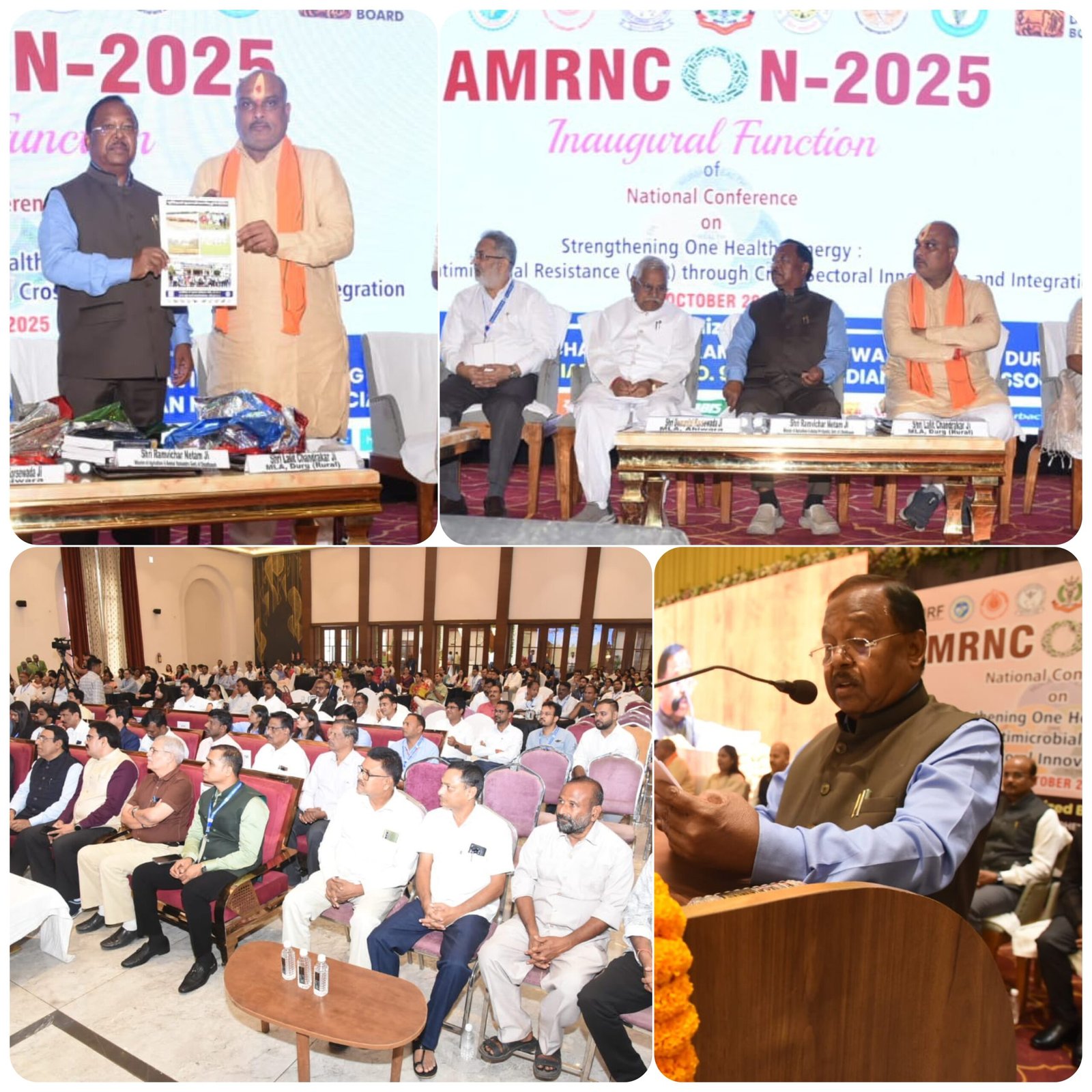 दुर्ग – दाऊ श्री वासुदेव चंद्राकर कामधेनु विश्वविद्यालय, दुर्ग में *अधिष्ठाता एवं कार्यकारी कुलपति डॉ.संजय शाक्य* की अध्यक्षता में इंडियन वेटनरी एसोसियेशन तथा इंडियन मेडिकल एसोसियेशन के संयुक्त तत्वाधान में *“स्ट्रेन्दनिंग वन हेल्थ सिनर्जीः कॅाम्बेटिंग एण्टीमाइक्रोबियल रेज़िस्टेंस (ए.एम.आर.) थ्रु क्रॉस सेक्टोरियल इनोवेशन एण्ड इंटीग्रेशन“* विषय पर दो दिवसीय *राष्ट्रीय सम्मेलन का उद्घाटन 06 अक्टूबर 2025* को दीप प्रज्वलन एवं विश्वविद्यालय कुल गीत से किया गया।