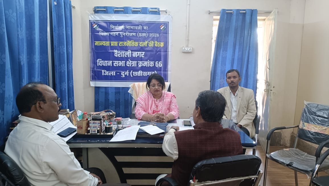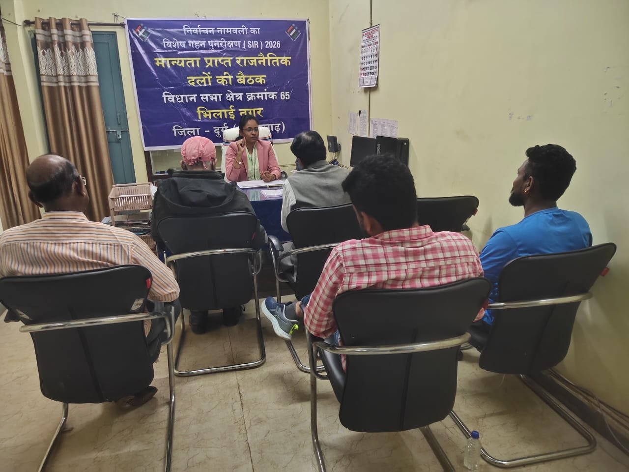 अपर कलेक्टर एवं उप जिला निर्वाचन अधिकारी बिरेन्द्र सिंह से प्राप्त जानकारी अनुसार जिले के समस्त विधानसभा 62-पाटन, 63-दुर्ग ग्रामीण, 64-दुर्ग शहर, 65 भिलाई नगर, 66-वैशाली नगर, 67-अहिवारा के निर्वाचक रजिस्ट्रीकरण अधिकारी के द्वारा बैठक में उपस्थित मान्यता प्राप्त राजनीतिक दलों के प्रतिनिधियों को मुख्य निर्वाचन पदाधिकारी, छ.ग. रायपुर के निर्देश के परिपालन में निर्वाचक नामावलियों का विशेष गहन पुनरीक्षण अर्हता तिथि 01.01.2026 के संदर्भ में दावा आपत्तियों की सूची साझा किये जाने एवं विशेष गहन पुनरीक्षण के संबंध में जानकारी साझा किये जाने साप्ताहिक बैठक आयोजित की गई। बैठक में उपस्थित राजनैतिक दलों के प्रतिनिधियों को कण्डिकावार जानकारी उपलब्ध कराई गयी।